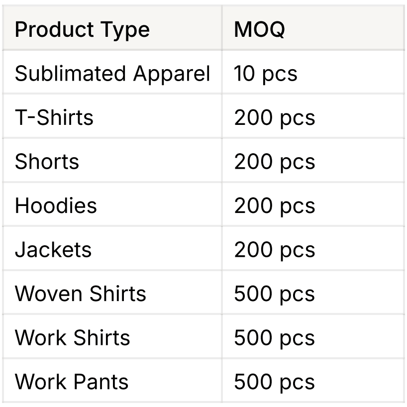 Minimum order quantities depend on the garment type and production method.